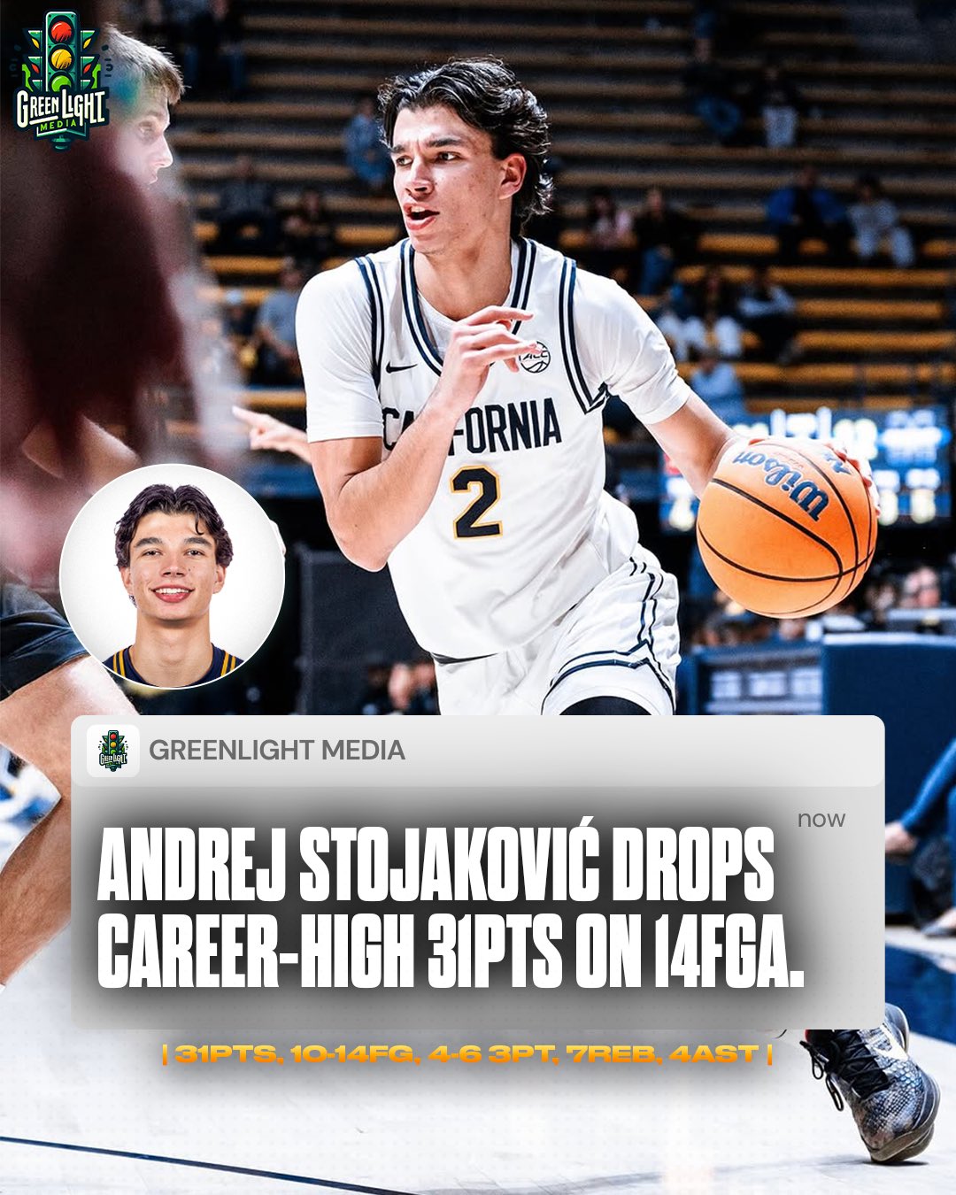 效力于加州大學(xué)伯克利分校的安德烈-斯托亞科維奇本場(chǎng)比賽狀態(tài)出色,他出戰(zhàn)35分鐘,14投10中,三分6中4,罰球8中7,砍下生涯新高的31分,另有7籃板4助攻3蓋帽進(jìn)賬。其父親佩賈本場(chǎng)比賽在現(xiàn)場(chǎng)督戰(zhàn)。