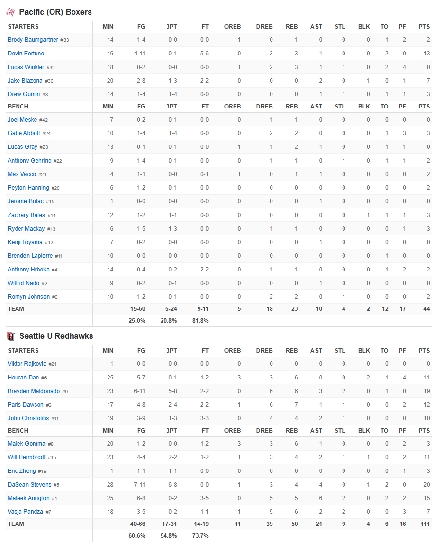 12月15日訊 NCAA常規(guī)賽,西雅圖大學(xué)111-44輕取俄勒岡太平洋大學(xué)。