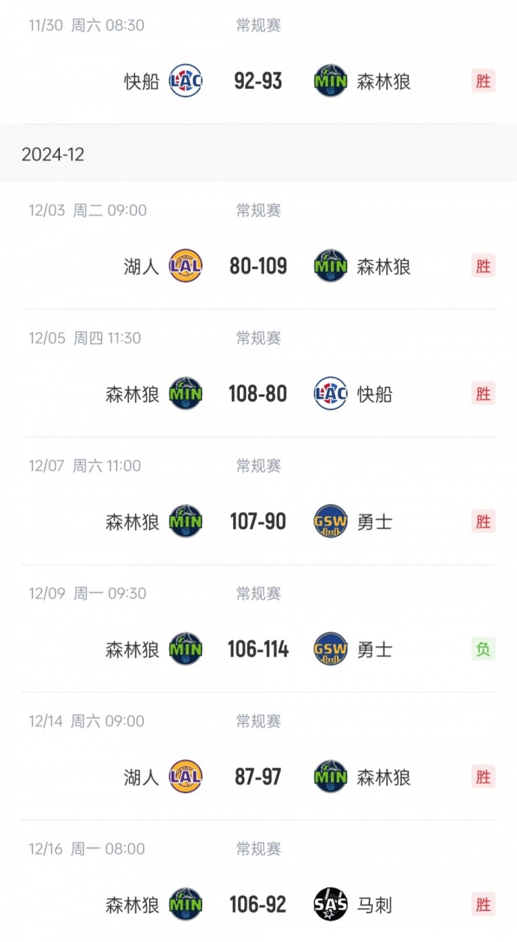 而在此之后,林狼的表現(xiàn)如脫胎換骨,連克快船(2次)、湖人(2次)、勇士、馬刺,僅在12月9日輸給勇士1次,期間取得了6勝1負的戰(zhàn)績。