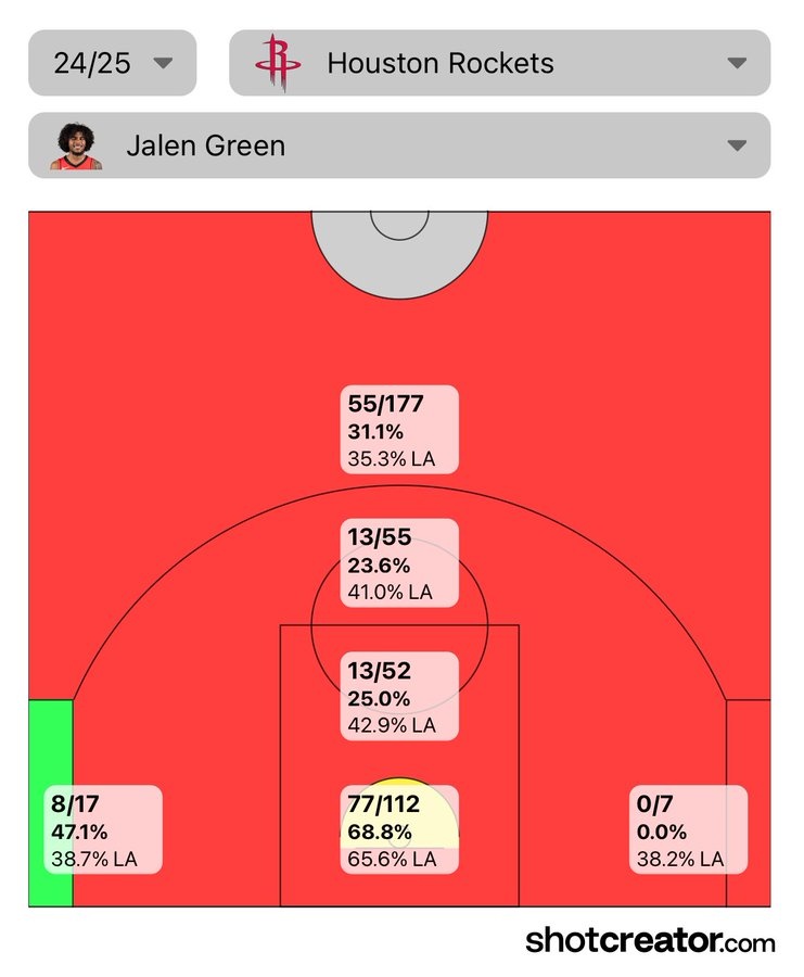 從投籃熱區(qū)圖中可以看出,本賽季至今杰倫-格林的中距離投籃命中率為23.6%,禁區(qū)內(nèi)油漆區(qū)以外的命中率也僅為25%。只有在右側(cè)底角三分線外和籃下,杰倫-格林的命中率才在40%以上,左側(cè)底角三分球合計7投0中。