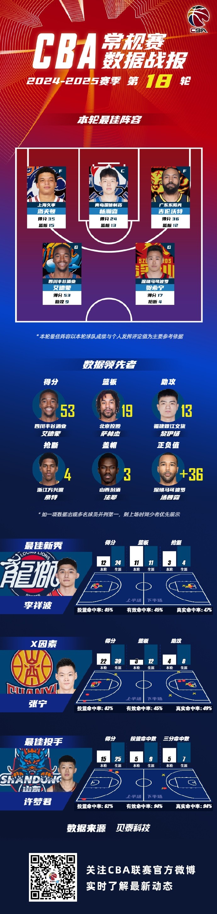 數(shù)據(jù)領(lǐng)先者方面:四川豐谷酒業(yè)球員艾德蒙以單場(chǎng)53分的數(shù)據(jù)領(lǐng)銜得分榜;