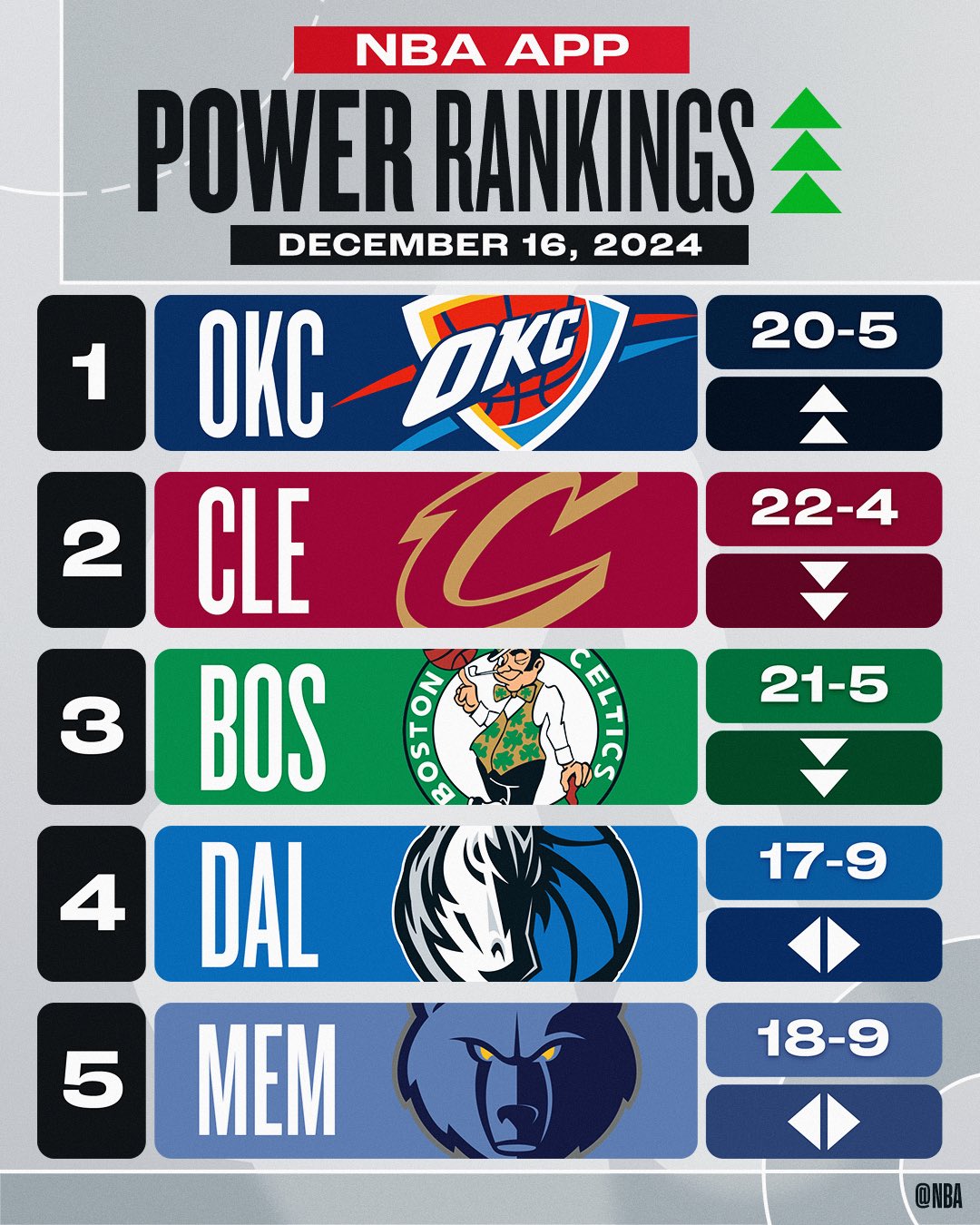 12月17日訊 NBA官方公布了最新一期戰(zhàn)力榜,其中雷霆升至第一,騎士凱爾特人分列二三,火箭上升一位來到第六,勇士快船排名狂跌,湖人從第19升至第18。