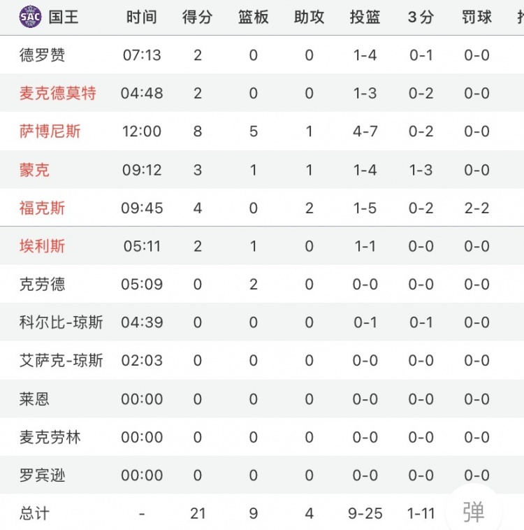 首節(jié)比賽,國王全隊進攻端狀態(tài)不在線,外線更是手感冰涼,在場上頻頻打鐵。其中投籃僅25中9,命中率36%;三分僅11中1,命中率9.1%。