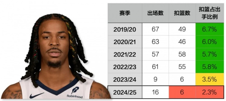 莫蘭特表態(tài)的“不扣籃”,也許真的不是說說而已。這名職業(yè)生涯扣籃集錦可能剪出時(shí)長(zhǎng)22分鐘鏡頭的旋風(fēng)小子,賽季至今只是完成了6次扣籃而已。而這個(gè)數(shù)字在他上一個(gè)健康的賽季,是55次,比很多內(nèi)線球員都多。