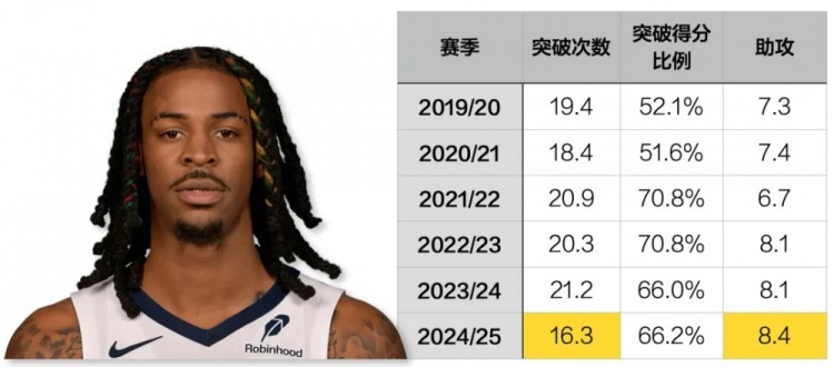 不難看出,莫蘭特調(diào)整了自己的進(jìn)攻方式,他減少了突破,減少了攻筐,取而代之的是更多分球。這也讓他的場(chǎng)均助攻數(shù)目前來到了生涯新高位置。