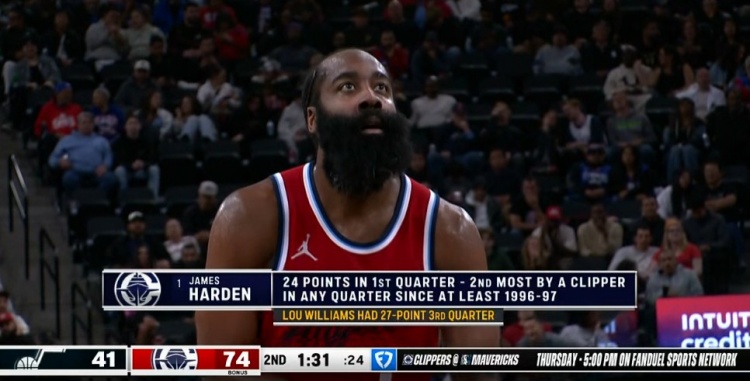 哈登首節(jié)個(gè)人獨(dú)砍24分,這是快船隊(duì)史單節(jié)第二高的個(gè)人得分,第一是路易斯-威廉姆斯的27分(2018年1月11日全場(chǎng)爆砍50分)。