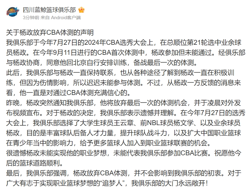 12月4日訊 四川男籃官方發(fā)布《關于楊政放棄CBA體測的聲明》,全文如下:
