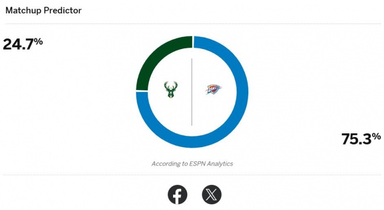 今天,ESPN預(yù)測(cè)本場(chǎng)比賽勝率,雷霆75.3%,雄鹿24.7%。