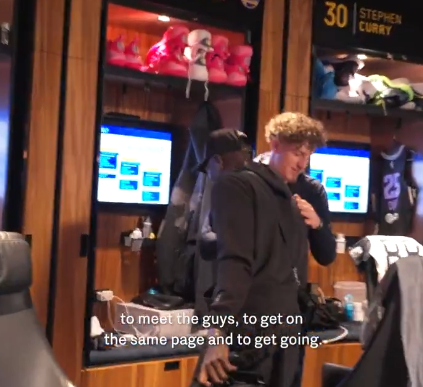 勇士官方曬施羅德來到灣區(qū)的小紀(jì)錄片,施羅德來到勇士更衣室,和波杰姆還有TJD握了握手~