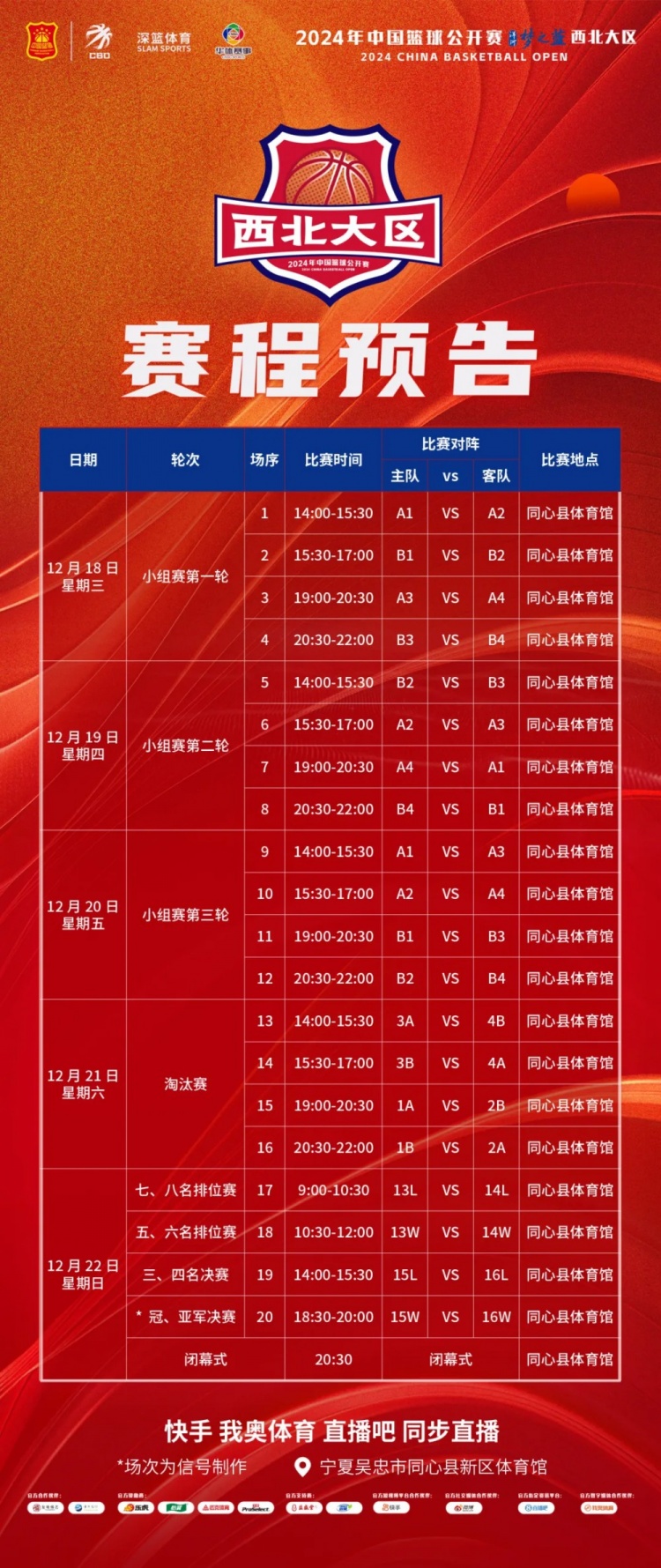 12月18日-22日,2024年中國籃球公開賽洋河夢之藍西北大區(qū)賽將在寧夏吳忠同心開打。屆時,來自濟源、西安、銀川、吳忠、呼和浩特、宜賓、德陽、阿拉善盟8個賽區(qū)的8支男子球隊將齊聚吳忠同心,展開激烈較量。