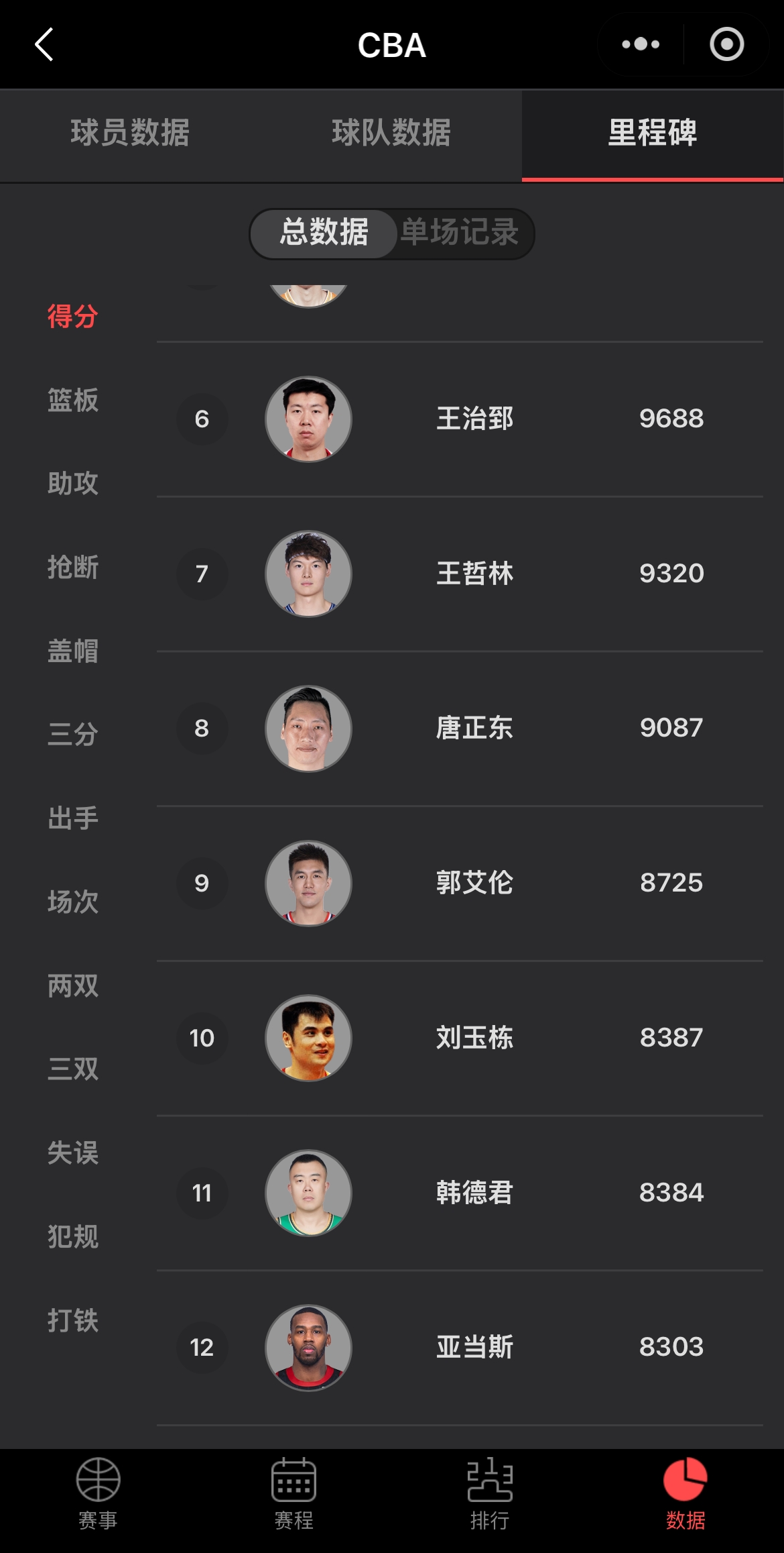 首節(jié)比賽,韓德君命中兩記補(bǔ)籃得到4分,CBA生涯總得分來到8388分,超越劉玉棟(8387分)躋身歷史前十。目前排在第九的是郭艾倫(8725分)。