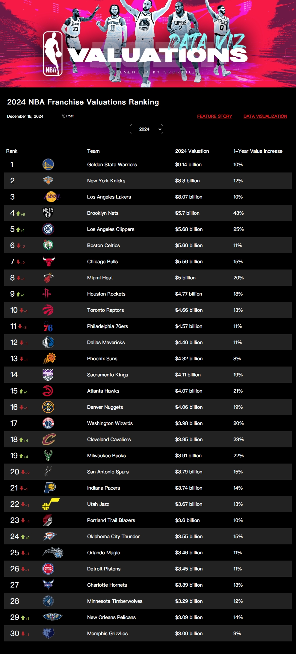 12月19日訊 今日,知名美媒Sportico發(fā)布了2024年NBA30支球隊的市值報告,其中勇士(91.4億美元)、尼克斯(83億美元)、湖人(80.7億美元)、籃網(wǎng)(57億美元,上升9位)、快船(56.87億美元)分列前五,灰熊(30.6億美元)墊底。