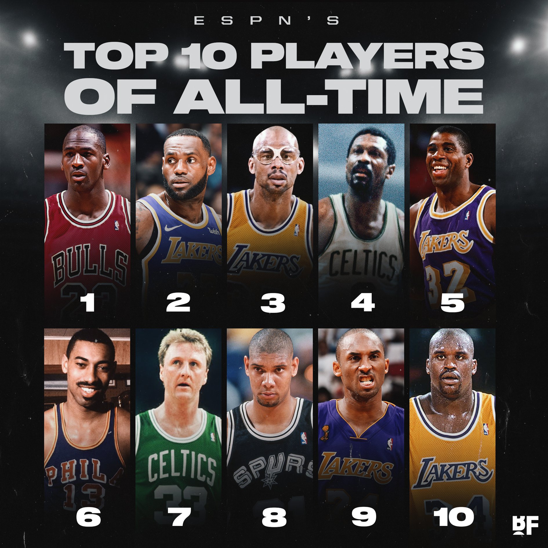 今日阿泰發(fā)推表示自己認為庫里已經(jīng)是歷史前十的球員了!今天我們聊聊,如果庫里進入前十,你覺得誰會掉出此前由ESPN評出的這個歷史前十榜單?