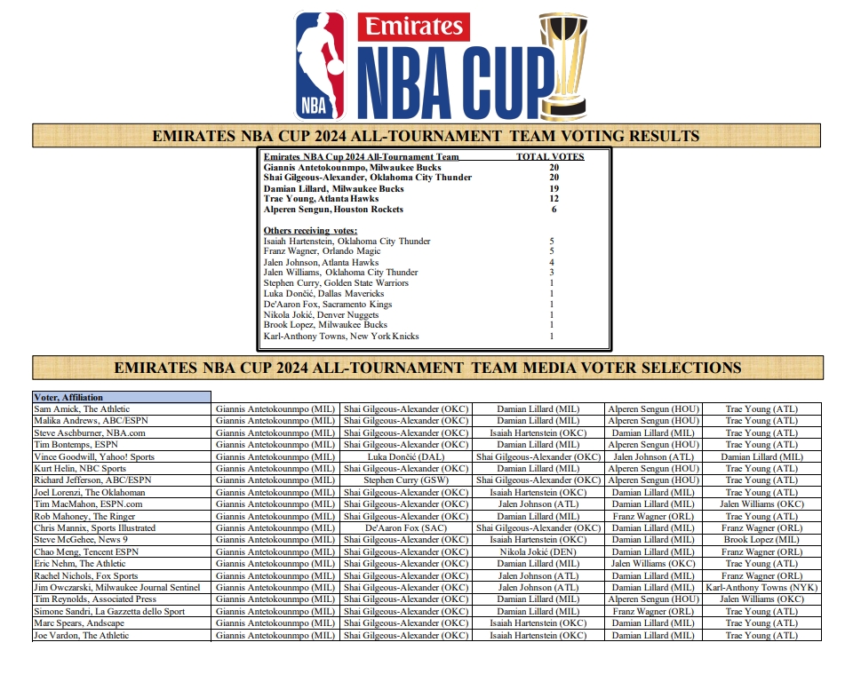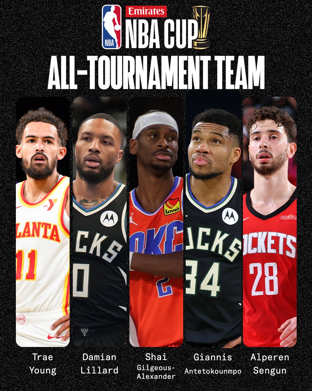 12月20日訊 NBA官方公布了本屆NBA杯的最佳陣容:字母哥、亞歷山大、利拉德、申京和特雷-楊。