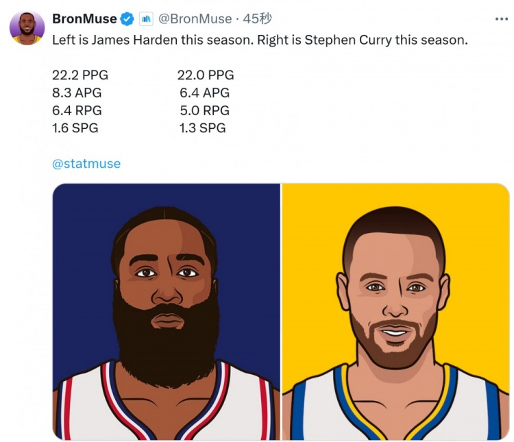 12月20日訊 今日美媒BronMuse對比了本賽季至今哈登和庫里的場均數(shù)據(jù):