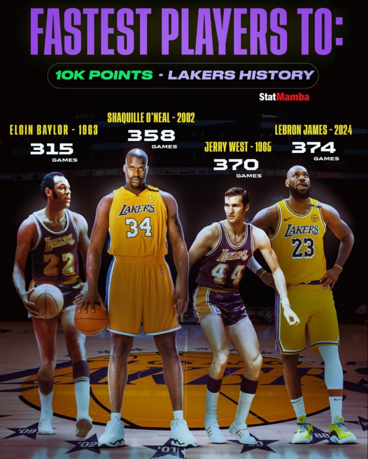 在本場比賽中,詹姆斯湖人生涯總得分突破10000大關(guān),這是他效力于湖人的第374場常規(guī)賽,隊(duì)史第四快,僅次于埃爾金-貝勒、奧尼爾和杰里-韋斯特。