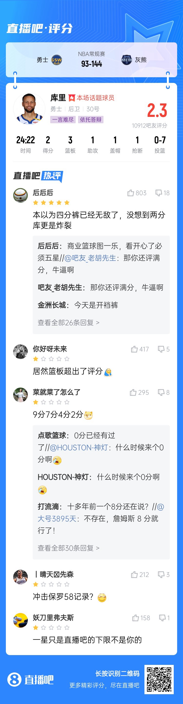 勇士今日遭灰熊51分血洗,是役庫里出場24分鐘,7投0中一分未得,打出了自己生涯數(shù)據(jù)上最慘淡的一場比賽。