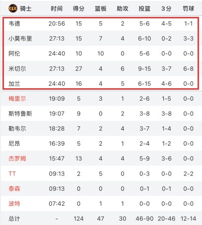 本場比賽騎士首發(fā)表現(xiàn)亮眼,五名球員全部得分上雙,其中米切爾15中9得到27分,加蘭15中6得到16分,阿倫6中5拿下10分,小莫布里10中6得到15分,迪恩-韋德6中5拿到15分。