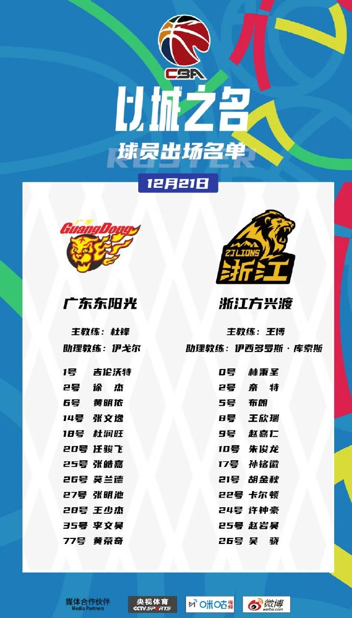 12月21日訊 今晚19:35,廣東對陣廣廈,賽前兩隊公布了本場的大名單,杜潤旺禁賽5場后今天復出,李文昊替換楊溢,廣廈雙星孫銘徽、胡金秋在列。
