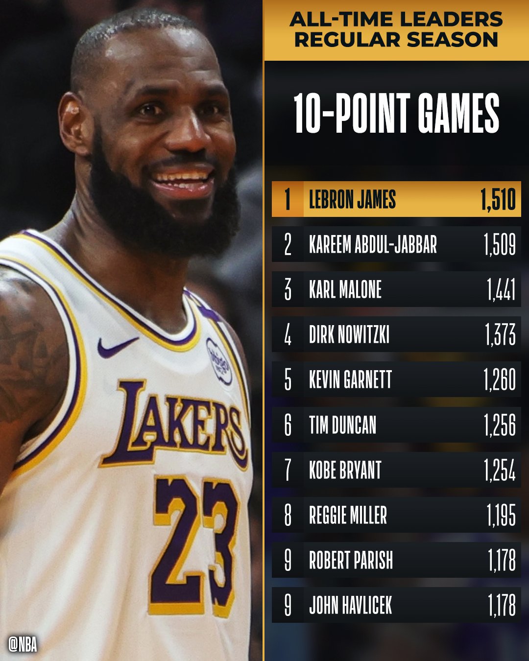 詹姆斯第一節(jié)7中5拿到12分,這樣詹姆斯的常規(guī)賽已經(jīng)1510場得分上雙,超越賈巴爾獨享歷史第一。