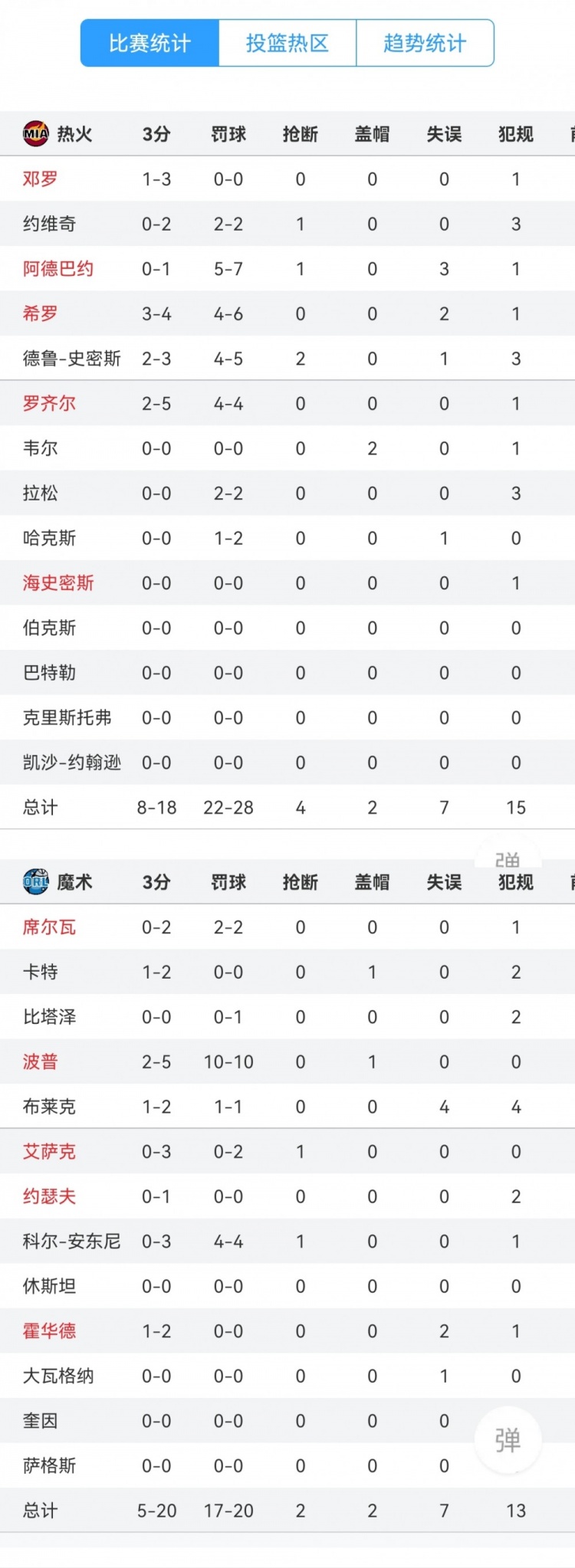 上半場,雙方陷入點(diǎn)球大戰(zhàn),場上哨聲十分頻繁,熱火被吹15次犯規(guī),獲得28次罰球命中22個(gè);魔術(shù)有13次犯規(guī),全隊(duì)20罰17中,其中波普10罰10中。
