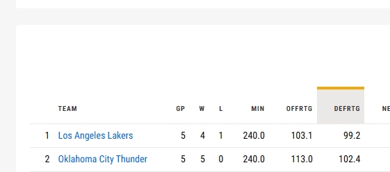 值得一提的是,湖人近5場(chǎng)的防守效率(百回合控制對(duì)手得分)已經(jīng)來(lái)到99.2,超越同期的雷霆(賽季至今總防守效率聯(lián)盟第一)高居聯(lián)盟第一!