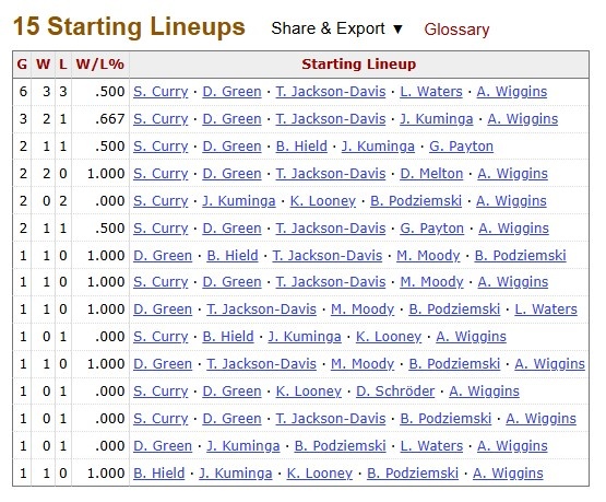 據(jù)統(tǒng)計(jì),勇士在本賽季至今的27場(chǎng)比賽中已經(jīng)使用過16套不同的首發(fā)陣容(此前15套陣容見下圖)。