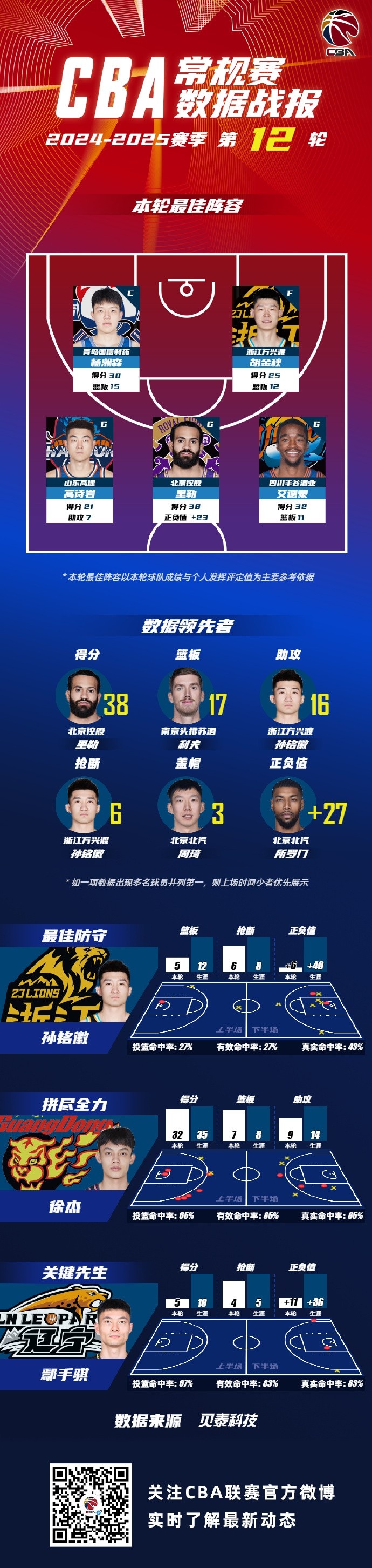 第12輪最佳防守球員由來(lái)自浙江方興渡的孫銘徽獲得;