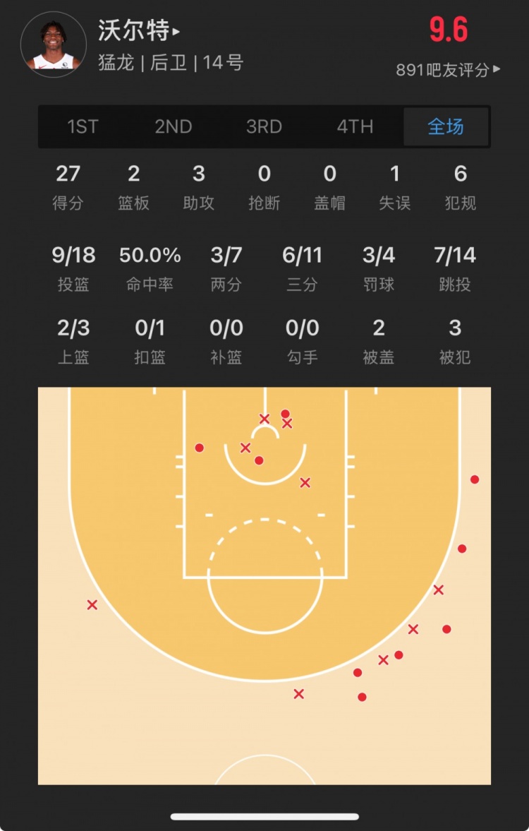 猛龍19號(hào)秀 賈科比-沃爾特 登場27.9分鐘