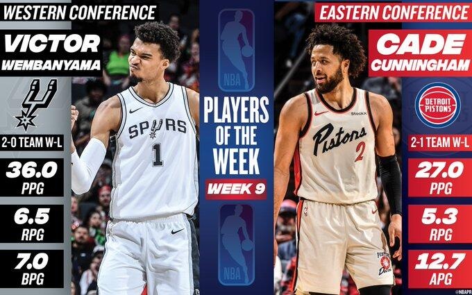 12月24日訊 NBA官方公布了第九周周最佳球員,西部文班亞馬和東部康寧漢姆。