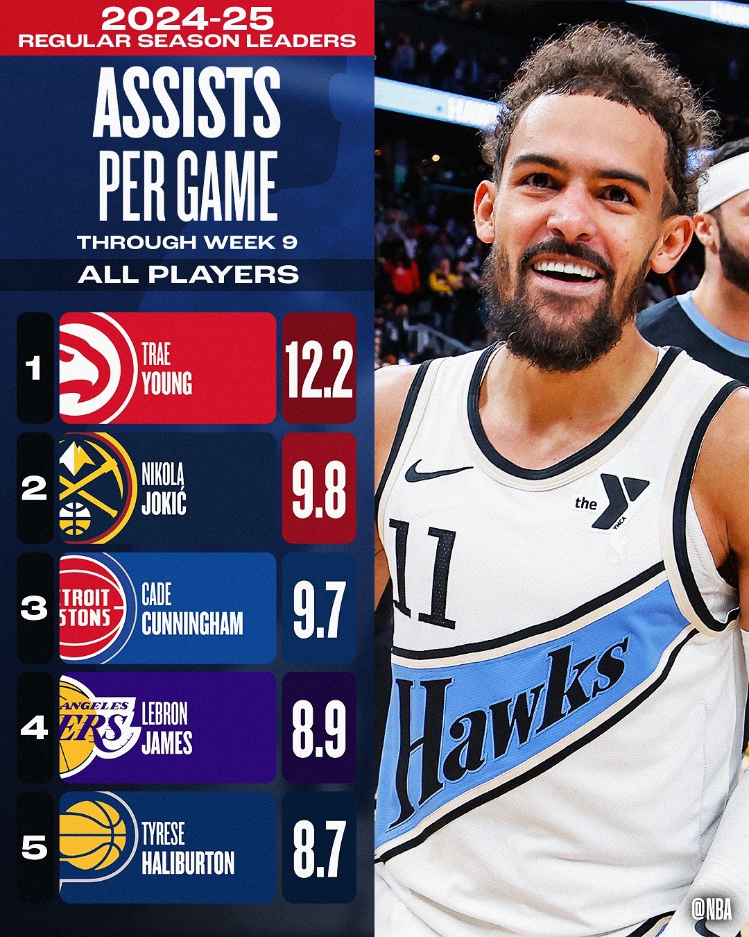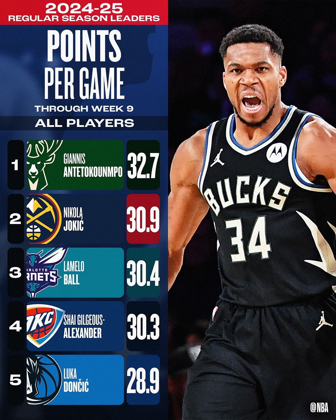 第9周數(shù)據(jù)榜:字母領跑得分王 特雷-楊斷層領跑助攻 文班蓋帽亮眼