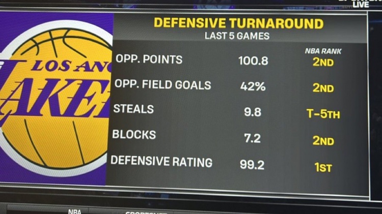 據(jù)統(tǒng)計(jì),在最近的5場(chǎng)比賽中湖人防守表現(xiàn)亮眼,他們4場(chǎng)比賽將對(duì)手得分限制在100分及以下,5場(chǎng)平均限制對(duì)手得到100.8分,限制對(duì)手投籃命中率42%,均為同期聯(lián)盟第二。
