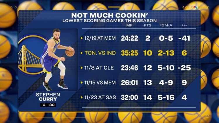 轉(zhuǎn)播方賽后曬出本賽季庫里得分最低的5場比賽數(shù)據(jù),除了今天外的比賽如下: