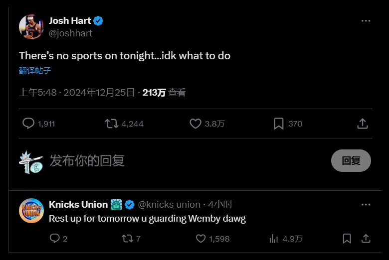 12月25日訊 今日無熱門體育賽事,哈特表示很無聊:“今天沒比賽看,我不知道該干嘛了......”
