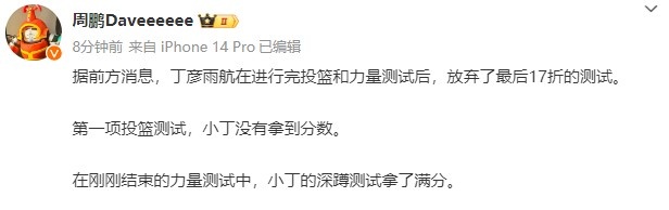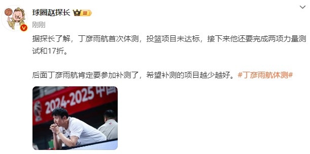 據(jù)媒體人@球圈趙探長報道,丁彥雨航首次體測,投籃項目未達(dá)標(biāo),接下來他還要完成兩項力量測試和17折。