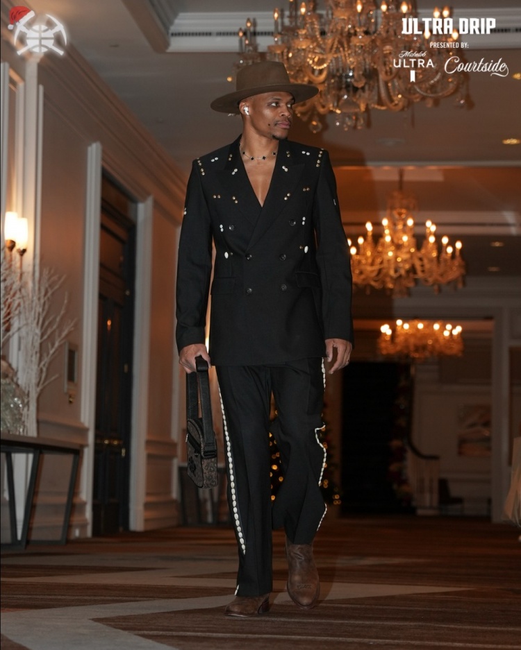 - 整個人都在發(fā)光!威少牛仔帽黑色套裝亮相圣誕大戰(zhàn)