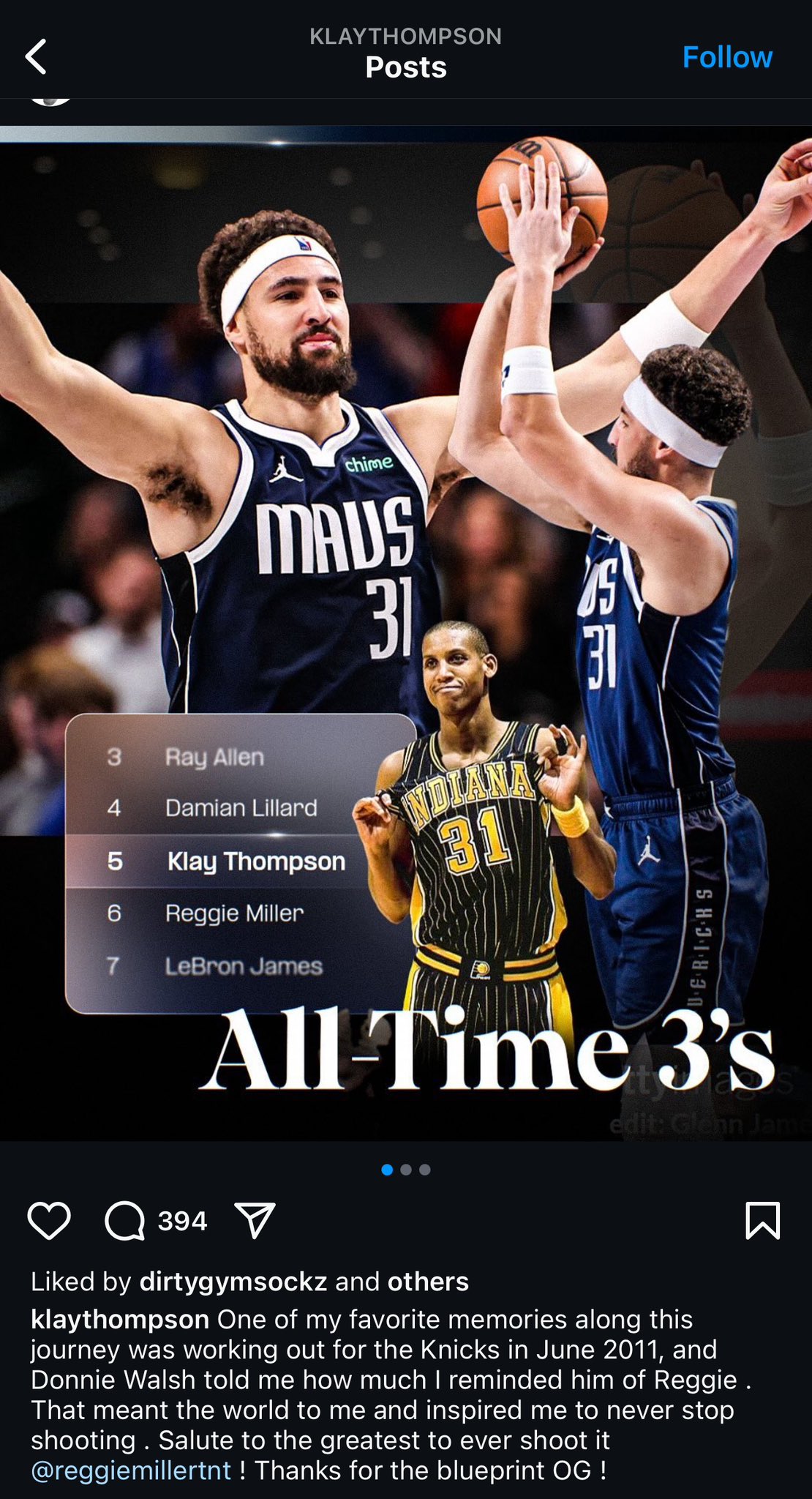 12月27日訊 克萊今日更新Instagram,曬照紀(jì)念自己超越偶像雷吉-米勒的三分里程碑。