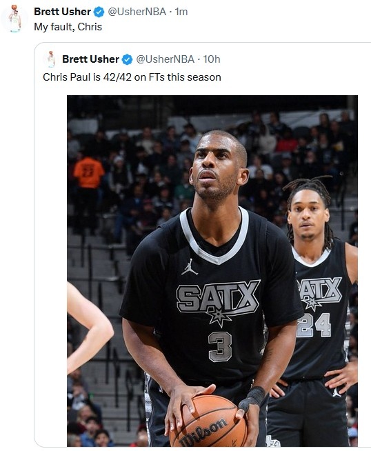 美媒Brett Usher在賽前發(fā)出保羅本賽季罰球全中的數(shù)據(jù),在保羅罰丟后馬上發(fā)圖調(diào)侃:“我的錯,保羅。”