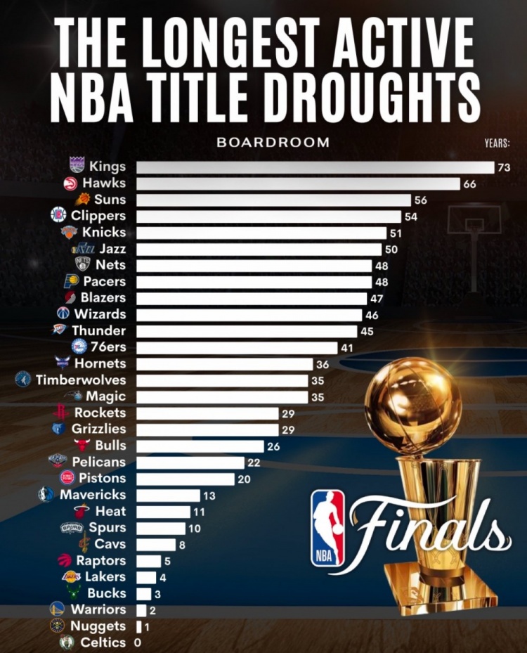 值得一提的是,在NBA球隊總冠軍荒排行榜上,國王目前73年無冠尷尬領(lǐng)跑,今天我們就來盤點下這份榜單。