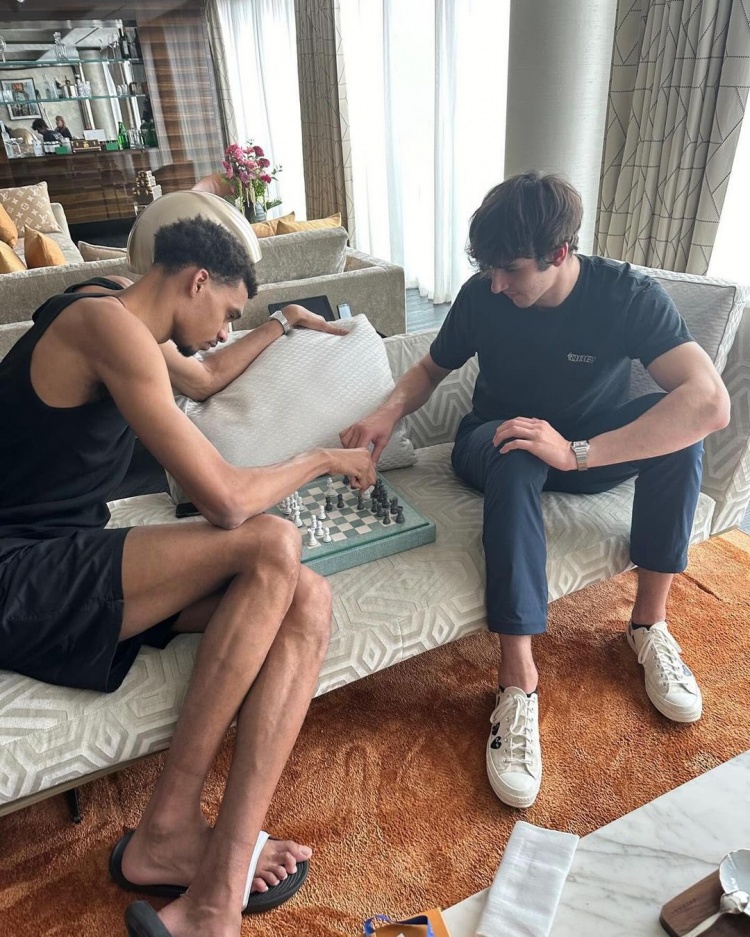 今年休賽期,文班亞馬曾被拍到與法國男籃小將馬克西姆-雷諾德下棋。