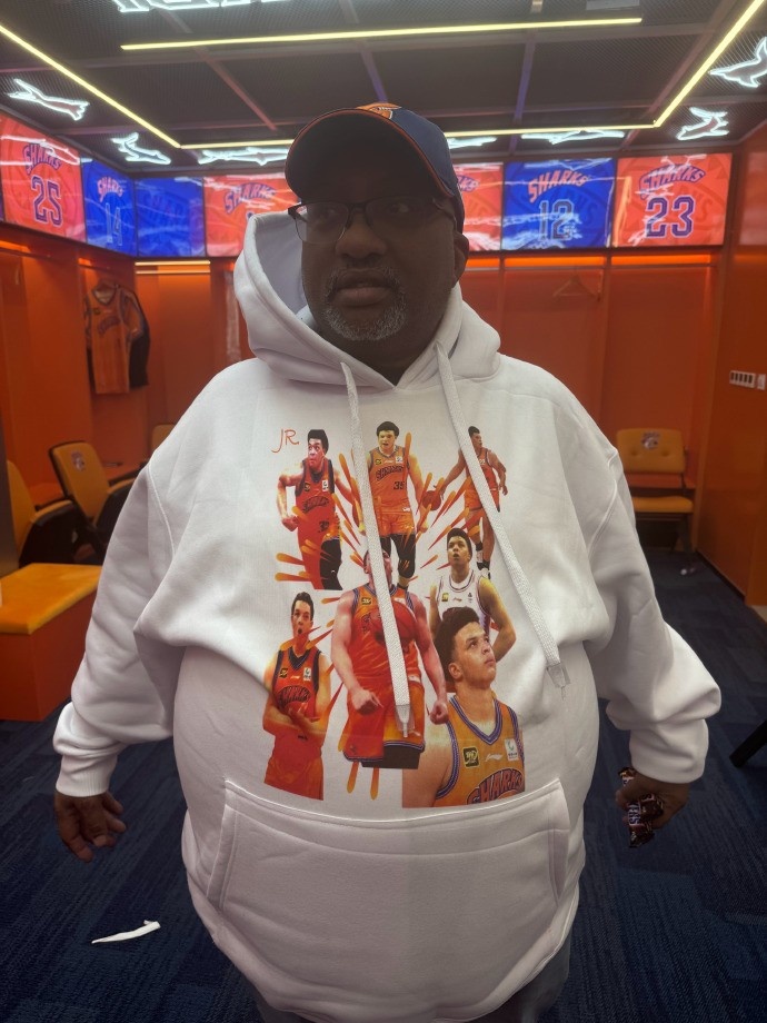 昨天打完比賽在更衣室碰到了洛夫頓的爸爸,簡單聊了幾句,他表示一家人都非常喜歡上海這座城市,也很感謝這么多球迷對(duì)洛夫頓的喜愛。洛夫頓爸爸真是一個(gè)非常非常nice的人,他非常為自己的兒子驕傲,主動(dòng)介紹說身上這件衛(wèi)衣是自己找地方去印制的,特意穿著來現(xiàn)場支持上海隊(duì)。