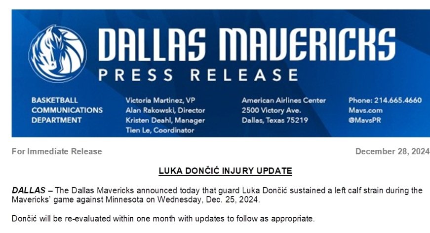 此前據(jù)名記Shams報(bào)道,消息源稱(chēng),東契奇遭遇左小腿拉傷,將在一個(gè)月后復(fù)查。東契奇在賽后接受了MRI檢查,多方會(huì)診后得出要至少傷缺一個(gè)月的建議。