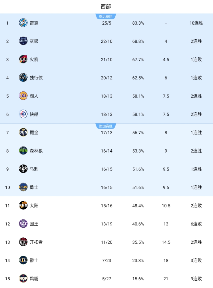 湖人戰(zhàn)績來到18勝13負(fù),憑借交手優(yōu)勢力壓同戰(zhàn)績的同城球隊(duì)快船,升至西部第五。