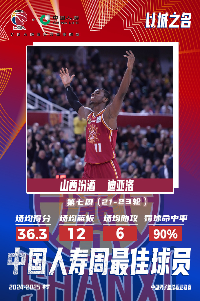 迪亞洛本周出戰(zhàn)3場(chǎng),場(chǎng)均上場(chǎng)34分鐘,可以得到36.3分、12籃板、6助攻、1.3搶斷、1蓋帽的全面數(shù)據(jù)。尤其在古德溫缺陣的2場(chǎng)比賽中,迪亞洛在攻防兩端承擔(dān)了更多責(zé)任,他在對(duì)陣深圳馬可波羅和浙江方興渡的比賽中連續(xù)砍下40+,率隊(duì)取得兩連勝。山西汾酒隊(duì)也在常規(guī)賽半程過(guò)后高居聯(lián)賽積分榜第二位。