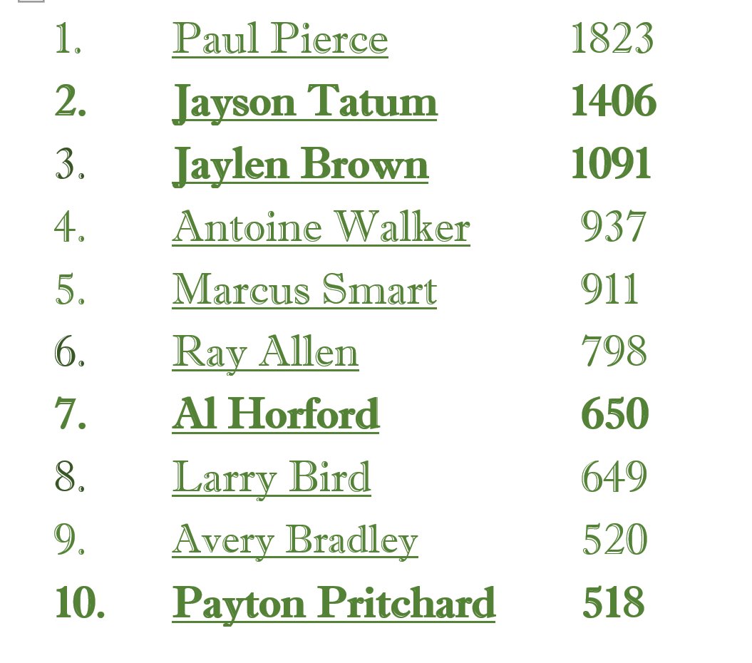 憑借本場比賽這記三分,霍福德的凱爾特人生涯三分命中數來到650記,超越拉里-伯德(649),上升至隊史第七位。