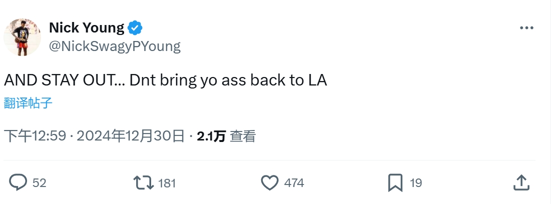 讓人忍俊不禁的是,此前和拉塞爾陷入過“錄音門”丑聞的尼克-楊發(fā)推:“走吧你?。 瓌eTM再回來洛杉磯了!”