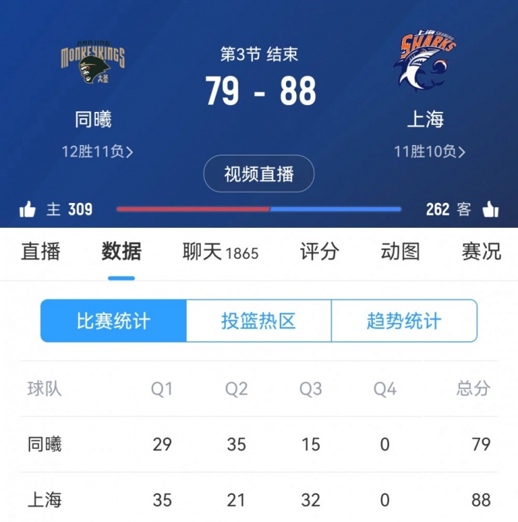 第三節(jié),上海攻防兩端壓制對手,單節(jié)以32-15凈勝對手17分,三節(jié)打完上海88-79領先同曦。