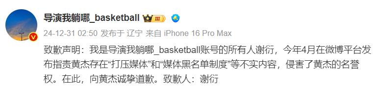 我是導(dǎo)演我躺哪_basketball賬號(hào)的所有人謝衍,今年4月在微博平臺(tái)發(fā)布指責(zé)黃杰存在“打壓媒體”和“媒體黑名單制度”等不實(shí)內(nèi)容,侵害了黃杰的名譽(yù)權(quán)。在此,向黃杰誠(chéng)摯道歉。