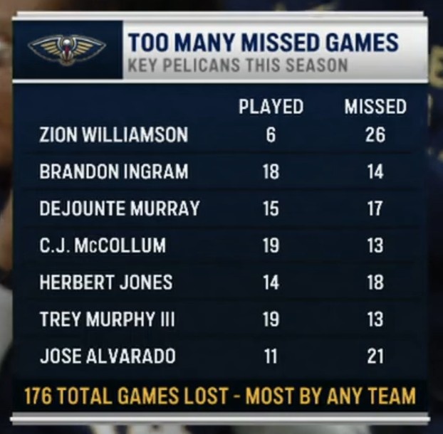 比賽中轉(zhuǎn)播方曬出一項(xiàng)數(shù)據(jù),本賽季鵜鶘關(guān)鍵球員總共缺席了176場(chǎng)比賽,聯(lián)盟最多!具體球員缺席場(chǎng)次如下: