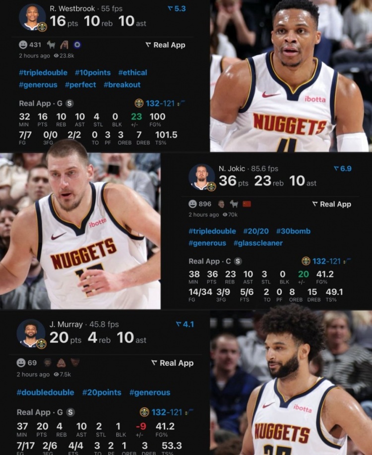 據(jù)統(tǒng)計(jì),威少、約基奇和穆雷同場(chǎng)皆得到至少15分10助攻,歷史首對(duì)三人組。